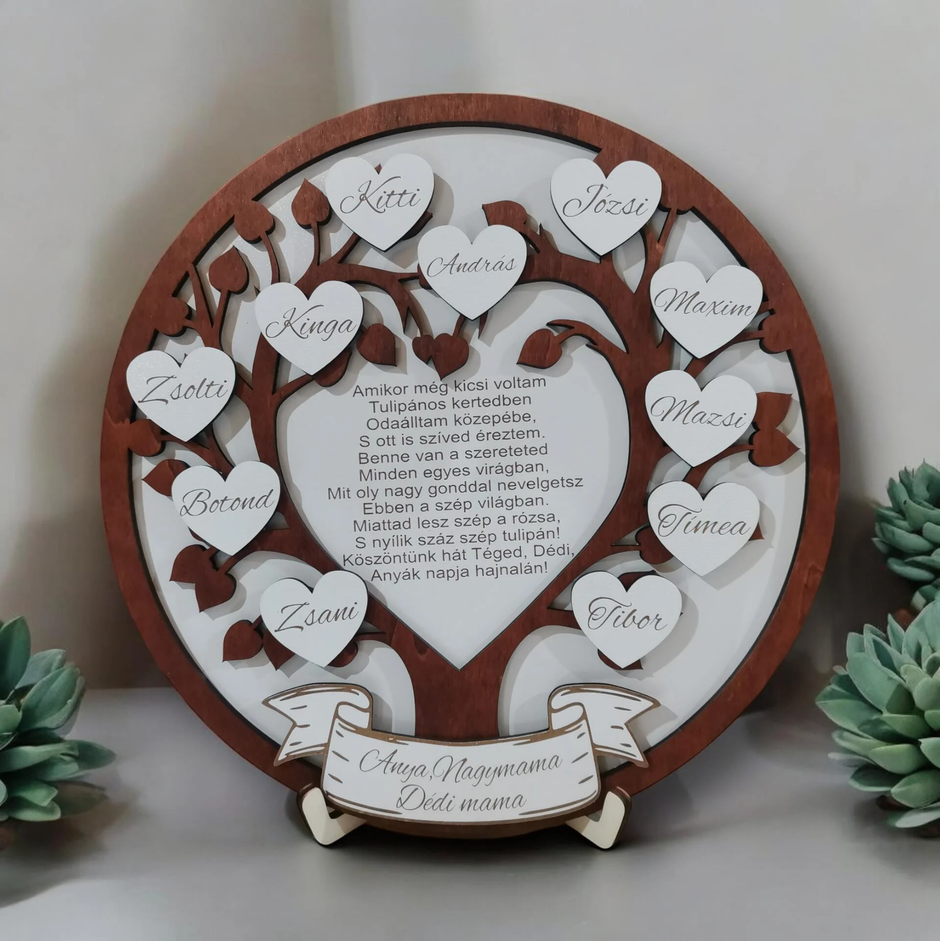 • Kialakítás: Gondosan kidolgozott fa motívum, középen egy megható verssel, amely személyre szabottan fejezi ki a hálát és emlékeket.