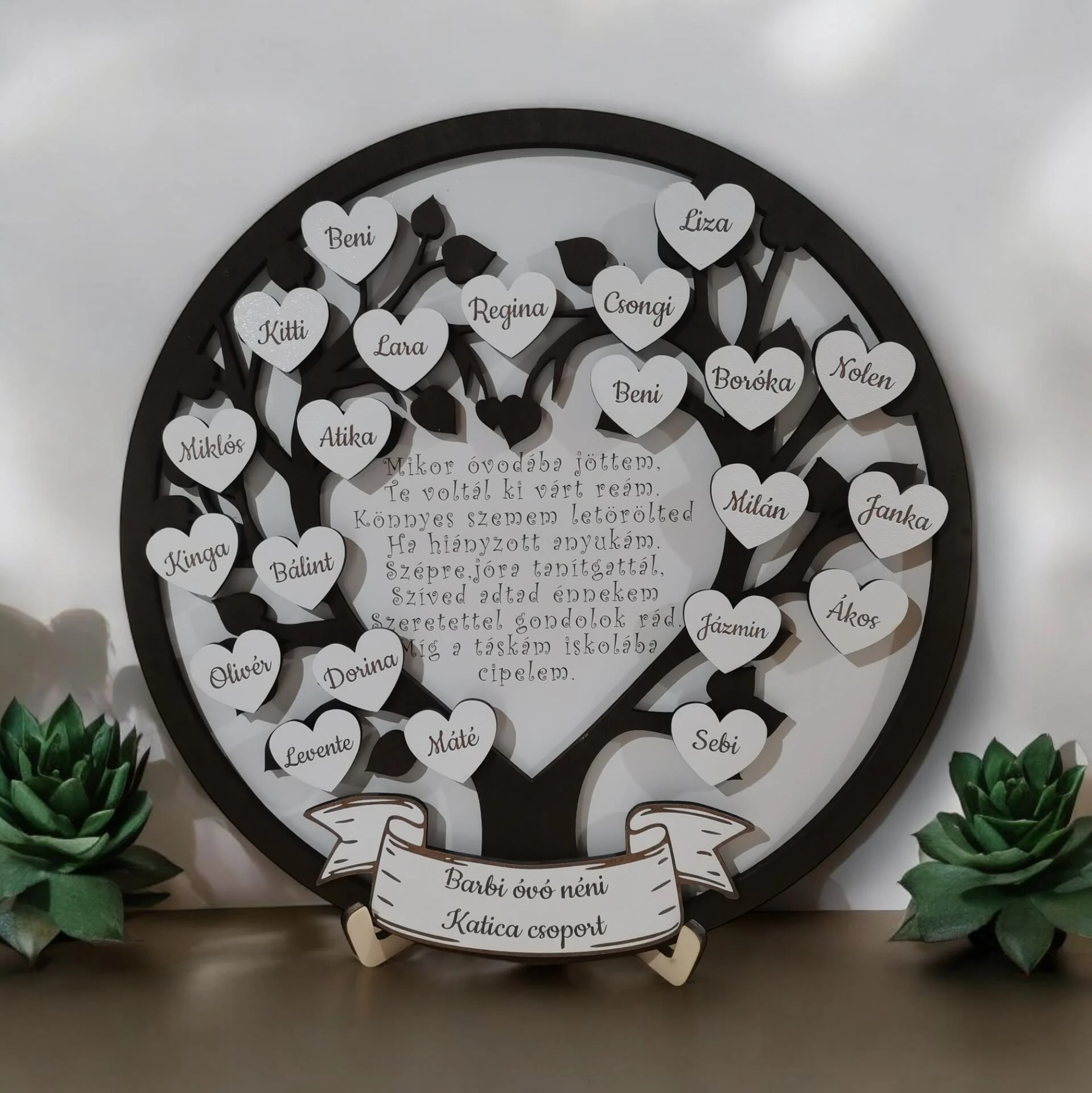 Ez a gyönyörű, fából készült emléktábla egy fa motívumot ábrázol, amelyen minden gyermek neve külön szív alakú díszen szerepel.