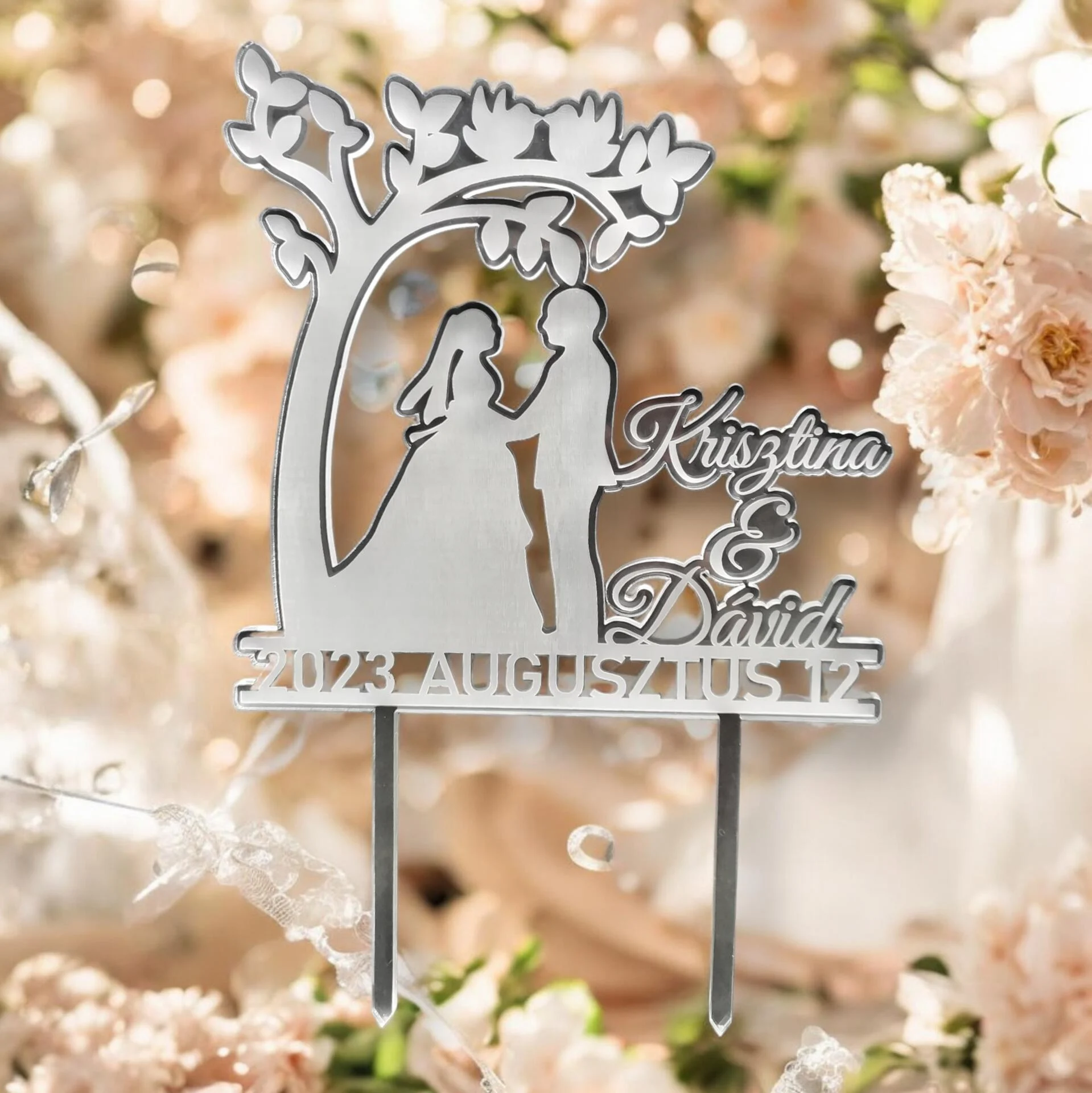 A nevek és dátumok finom betűképpel kerülnek gravírozásra, így tökéletesen illeszkedik az ünnep hangulatához.