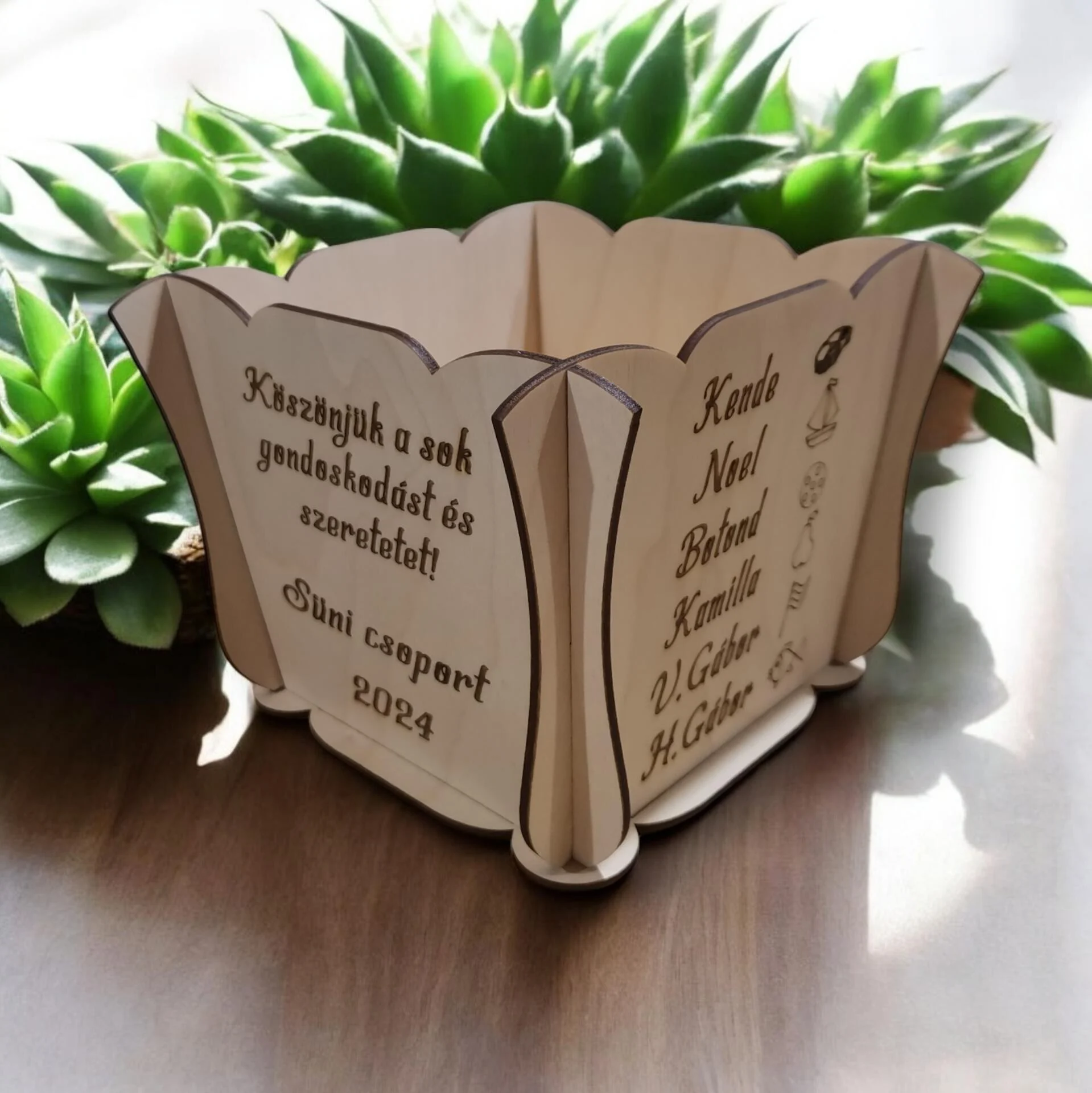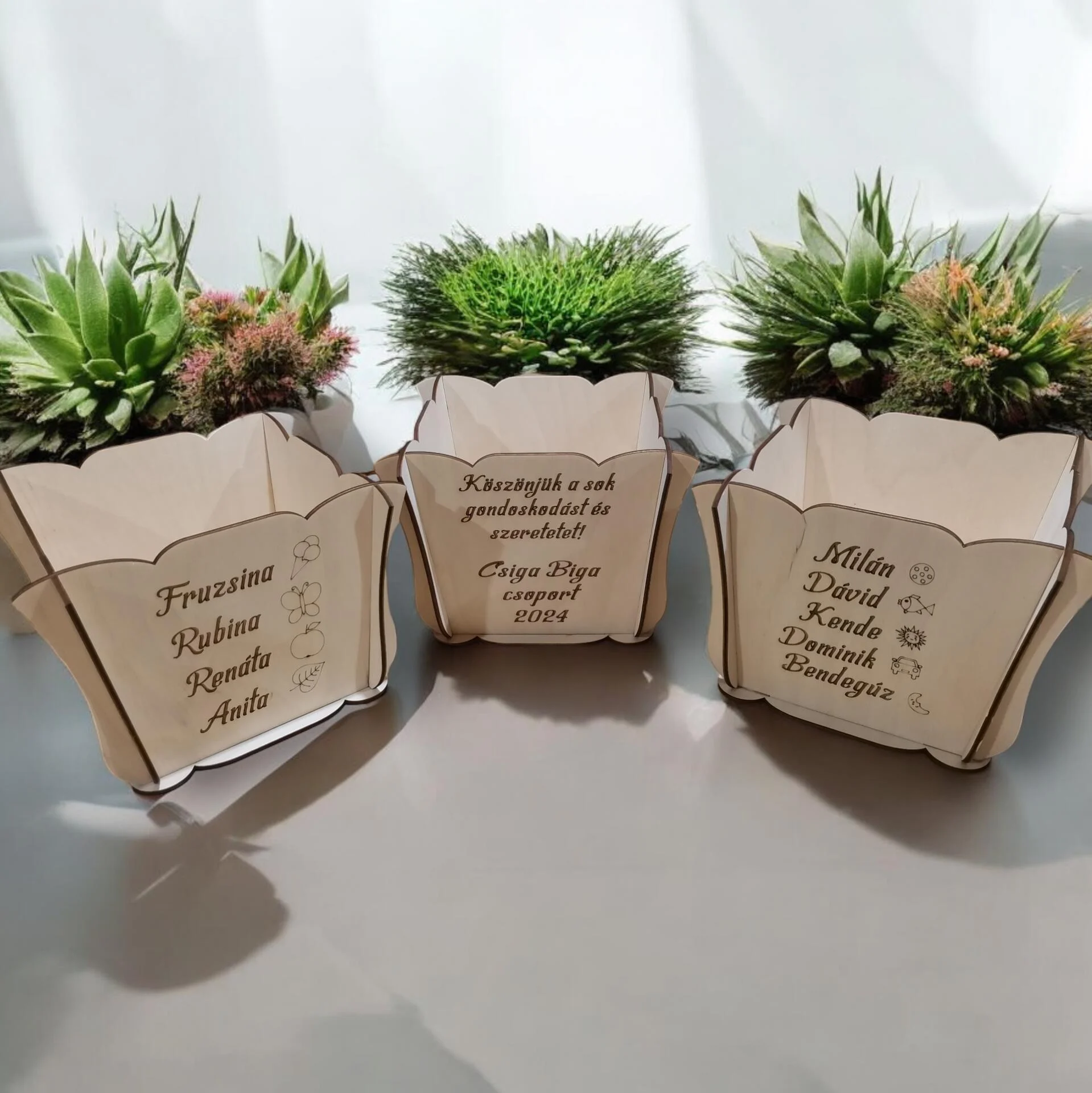 Ez a különleges, fából készült gravírozott virágtartó ideális búcsúajándék az óvónőknek és dajkáknak,