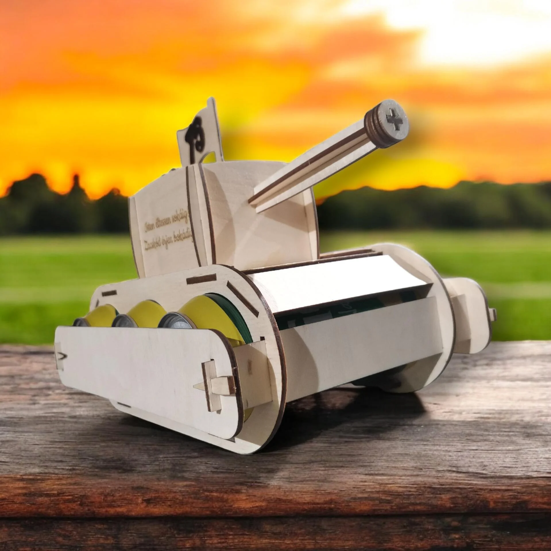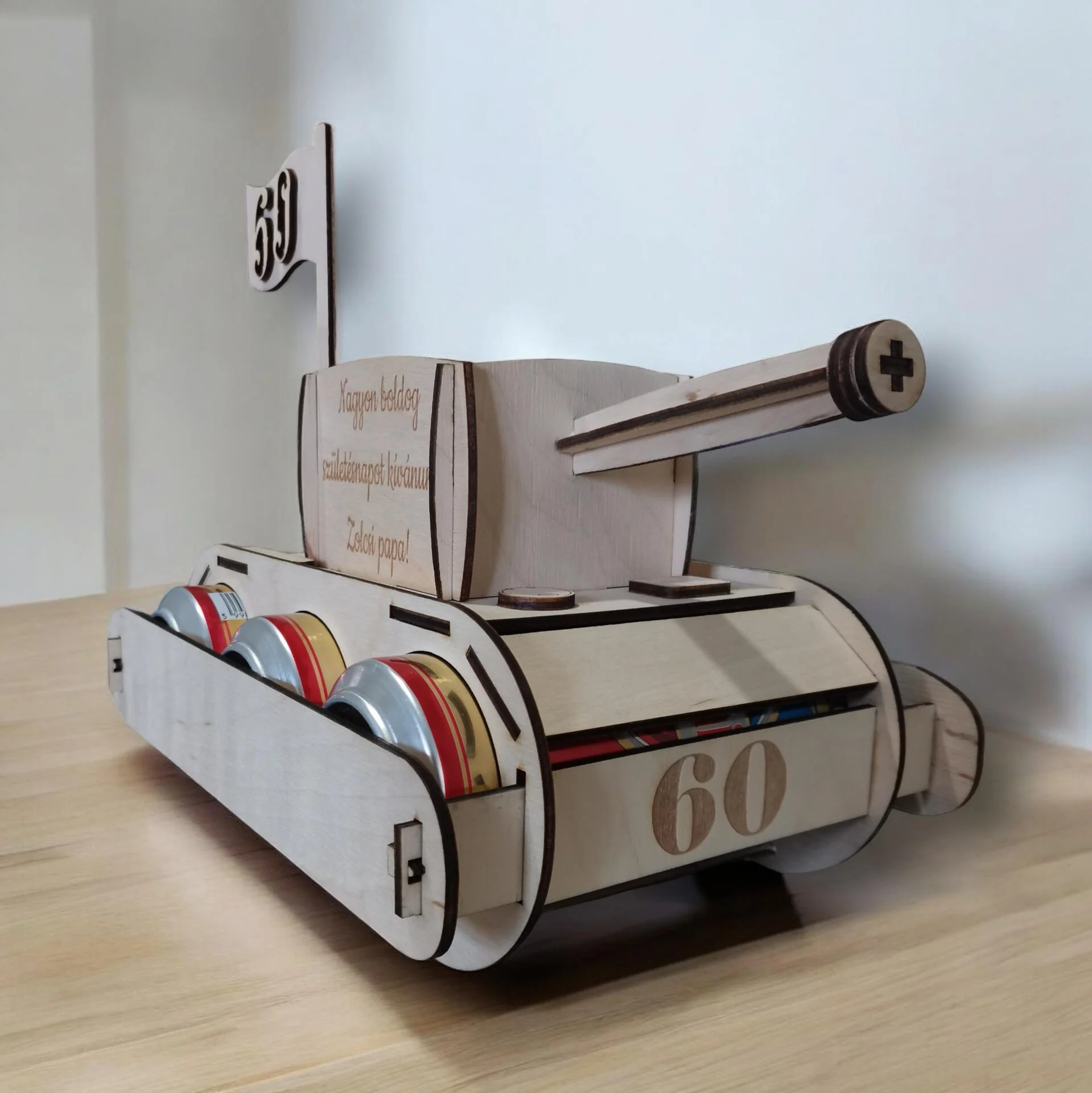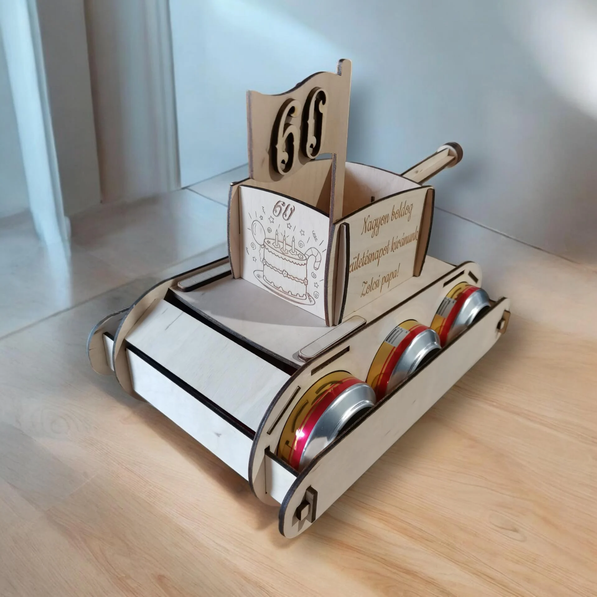 Ajándékozz igazán egyedi és humoros ajándékot szeretteidnek! Ez a fából készült, különleges sörtartó tank három darab 0,5 literes dobozos sör tárolására alkalmas,