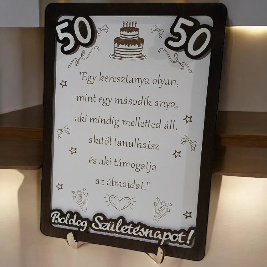 Miért válassza ezt a terméket? Ez a dísztábla nemcsak egy ajándék, hanem egy emlékezetes emléktárgy is, amely örökké megőrzi az ünnepelt számára ezt a különleges pillanatot. A gondosan megtervezett, gravírozott üzenet és a finom részletek kiemelik az alkalom fontosságát, és örömet szereznek a megajándékozottnak.